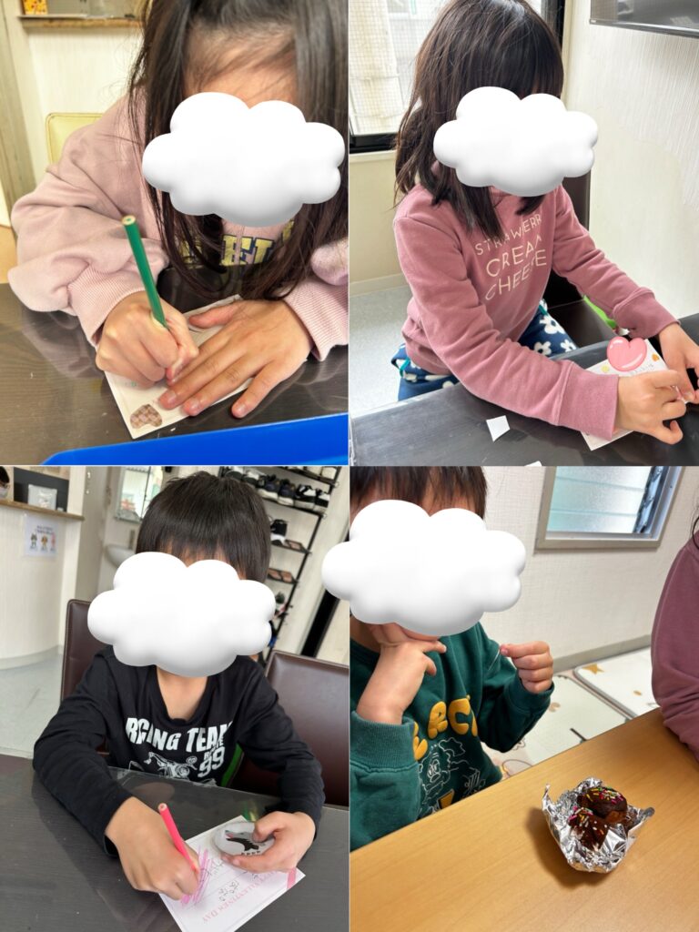 お箸でマシュマロやドーナツをキャッチするのが少し難しかった児童もいましたが、お箸の持ち方を変えてみたり、お皿を近づけてみたりと自分で工夫して作られていました😊